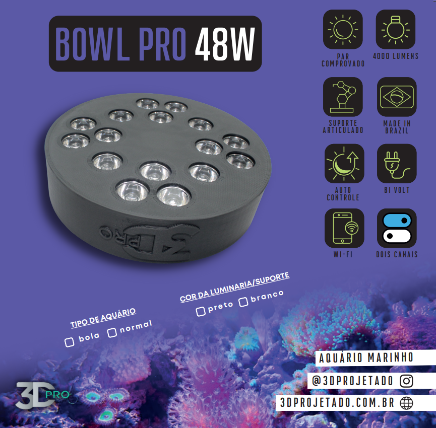 A Luminária foi projetada para atender os mais diferentes aquários, do mais simples até o profissional. Luminária produzida em ABS de alta qualidade, com suporte regulável para aquários Bola (Bowl). Acompanha hastes de Alumínio que podem ser cortados de acordo com o tamanho/altura do seu aquário Bola.