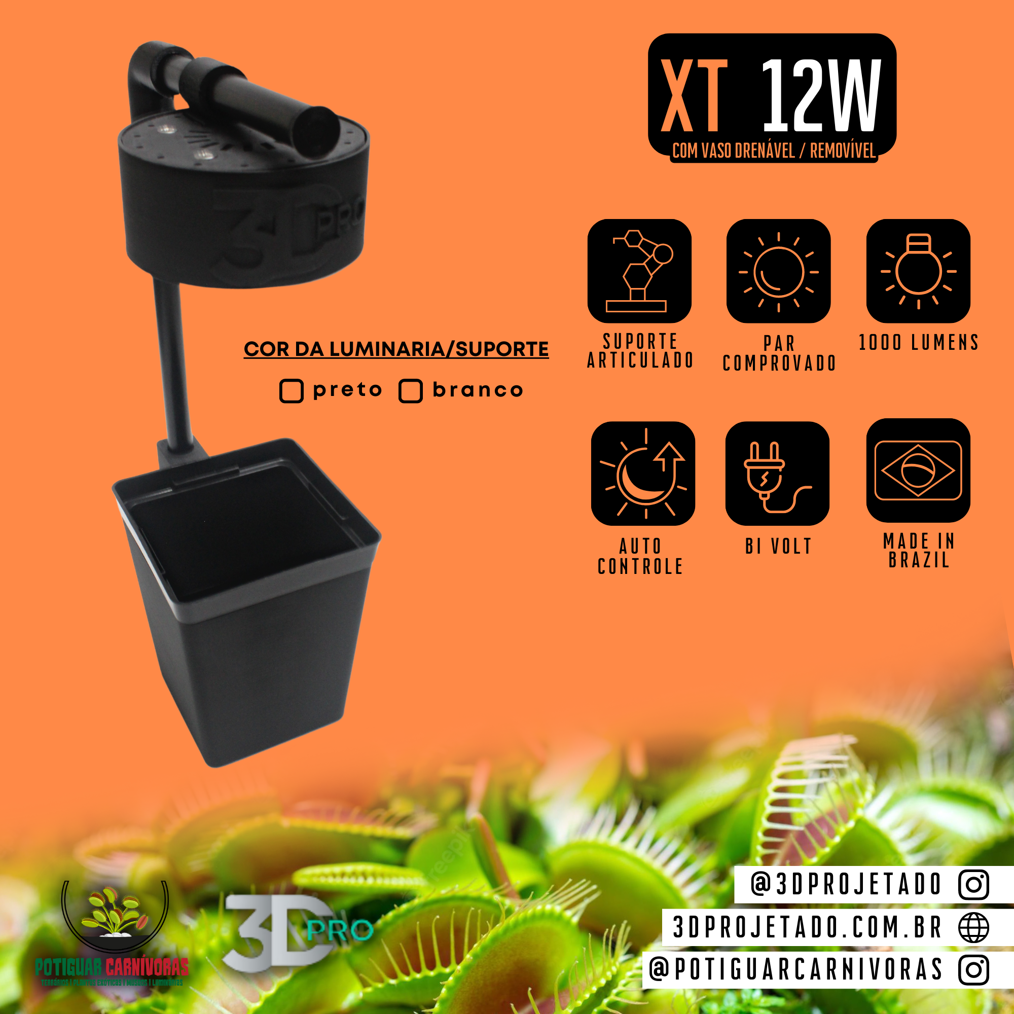 A Luminária foi projetada para atender plantas carnívoras ou plantas de alta necessidade de luz A luminária esta acompanhada de um suporte com altura e largura reguláveis, e vaso drenável e removível. A altura do vaso é 10cm por 9cm aproximadamente e é feito de plástico ABS